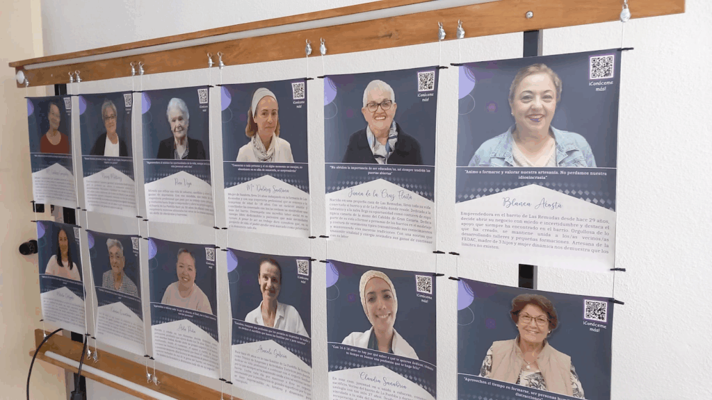 En el curso 23/24 La Básica de Electricidad aportó, para visibilizar el papel protagonista de la mujer en el barrio, el proyecto Mujer sin Más. Tras un proceso de empatía e investigación que les llevó a conocer vidas de mujeres del barrio, elaboraron un panel itinerante con base eléctrica que pone cara e historia a las vecinas y que desde entonces viaja por distintas ubicaciones del barrio. “En los proyectos nos interesa mucho que el alumnado vaya al barrio y que el barrio venga al centro; esos encuentros siempre son enriquecedores”- comenta Yaiza. En este proyecto entrevistaron a la farmacéutica que hace una enorme labor de cuidado y asistencia a personas incapacitadas que no pueden recoger sus medicamentos; o a la mujer del 24 horas que salvó a muchas personas del hambre en las épocas difíciles.”
