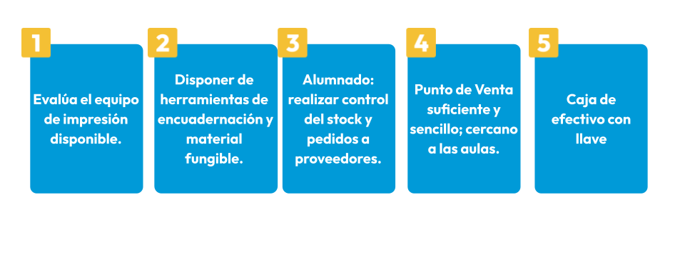 La idea surgió cuando el servicio externalizado de copistería del centro dejó de prestar servicio. Dado que el ciclo de Servicios Administrativos incluye en su currículo aspectos como la encuadernación básica, se pensó que el taller en el que se desarrollaban sus prácticas con la guillotina, la fotocopiadora, plastificadora, taladradora,etc. se convirtiera en una copistería “de verdad”, donde el alumnado atiende a cualquier alumno o profesor que lo necesite durante toda la jornada, a excepción de la media hora del recreo.